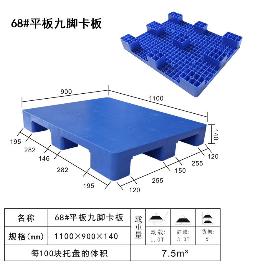 | Color | Low blue,blue,yellow,black,green,red,white,grey,other | Dynamic load | 1T | Material | PP,PE | Model | Four-way | Scope | Food pharmaceutical and chemical industries such as textile parts factory warehouse logistics transportation | size | 1100×900×140 | Static load | 3T | Type | Single side | 100 volume | 7.5m3 | Shelf | X |