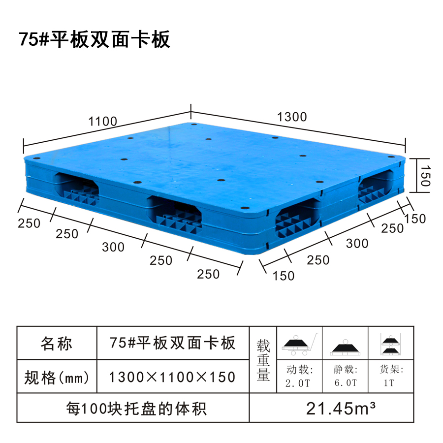 | Color | Low blue,blue,yellow,black,green,red,white,grey,other | Dynamic load | 2T | Material | PP,PE | Model | Four-way | Scope | Chemical industry, food and beverage, flour processing industry | size | 1300×1100×150 | Static load | 6T | Type | Double sided | 100 volume | 21.45m3 | Shelf | √ |
