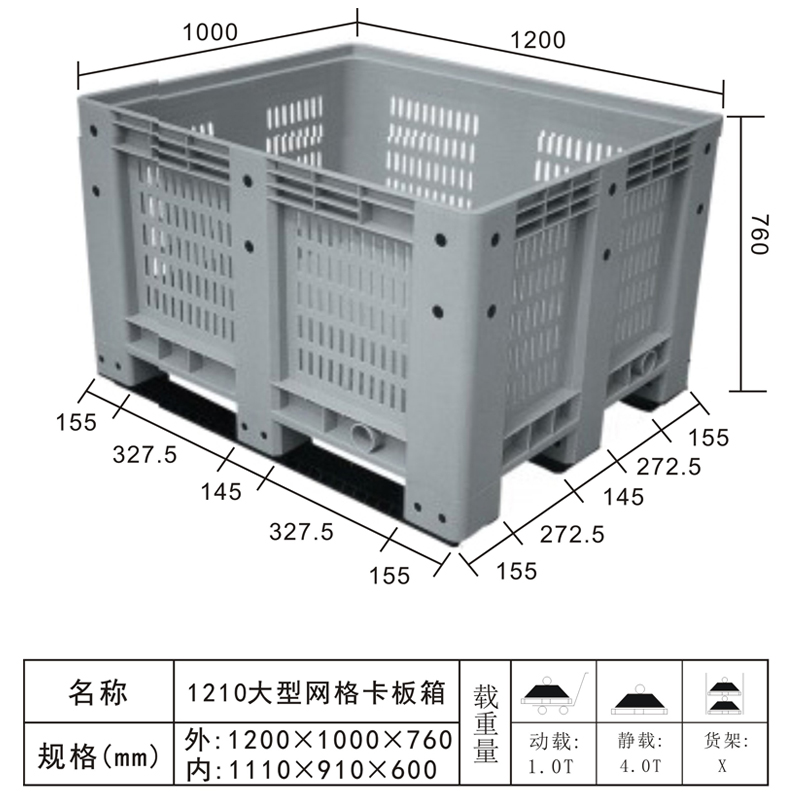 3、塑料卡板箱比同類型木箱及金屬箱重量輕很多,采用一體成型所以在搬運(yùn)和運(yùn)輸中性能更好;