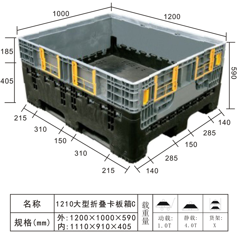 | Color | Low blue,blue,yellow,black,green,red,white,grey,other | Dynamic load | 1T | Material | PP,PE | Model | Four-way | Scope | Packaging, storage and transportation of various components and raw materials | size | 1200x1000x590 | Static load | 4T | Type | Turnover box | 100 volume | -- | Shelf | -- |