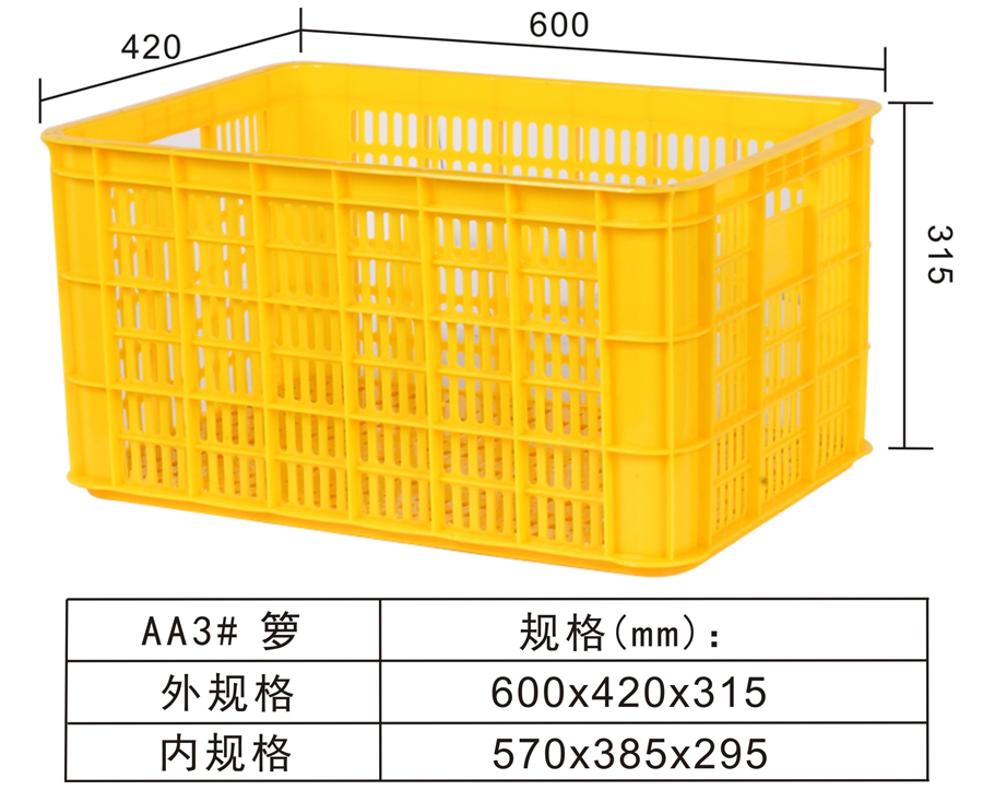 | Color | Low blue,blue,yellow,black,green,red,white,grey,other | Dynamic load | -- | Material | PP,PE | Model | -- | Scope | Fruits, vegetables, machinery parts, refrigeration, storage, transportation and other industries | size | 600×420×315 | Static load | -- | Type | Turnover basket | 100 volume | 8m3 | Shelf | -- |