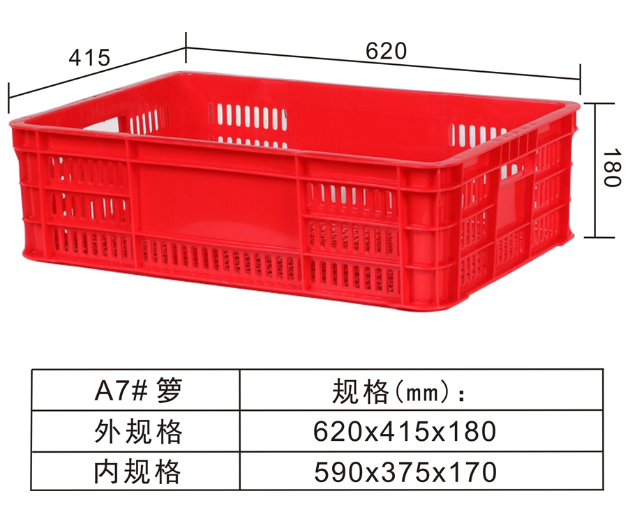 | Color | Low blue,blue,yellow,black,green,red,white,grey,other | Dynamic load | -- | Material | PP,PE | Model | -- | Scope | Fruits, vegetables, machinery parts, refrigeration, storage, transportation and other industries | size | 620×415×180 | Static load | -- | Type | Turnover basket | 100 volume | 4.5m3 | Shelf | - |